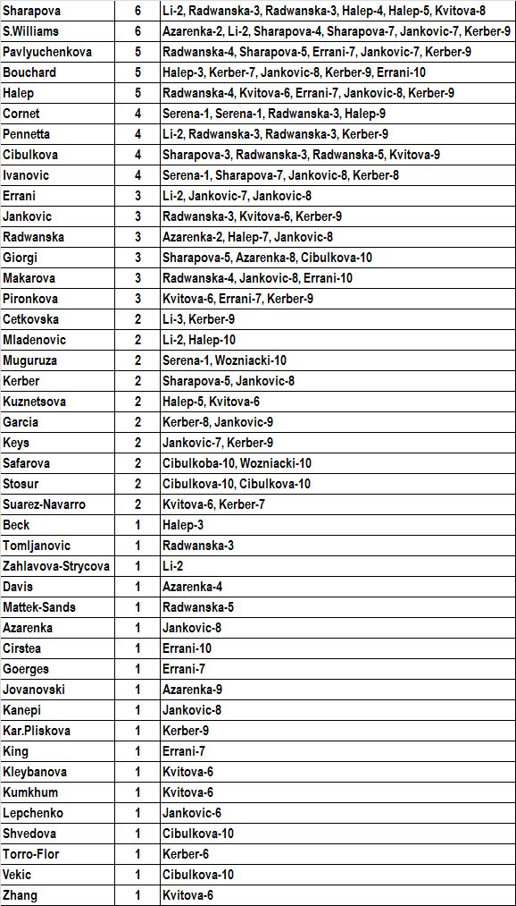 1. Serena Williams (1)2. Na Li (2)3. Simona Halep (3)4. Petra Kvitova (6)5. Agnieszka Radwanska (4)6. Maria Sharapova (5)7. Eugenie Bouchard (13)8. Angelique Kerber (7)9. Jelena Jankovic (8)10. Victoria Azarenka (9)11. Ana Ivanovic (11)12. Dominika Cibulkova (10)13. Flavia Pennetta (12)14. Sara Errani (14)15. Caroline Wozniacki (16)16. Carla Suarez Navarro (15)17. Lucie Safarova (23)18. Samantha Stosur (17)19. Ekaterina Makarova (22)20. Andrea Petkovic (20)21. Alize Cornet (24)22. Sloane Stephens (18)23. Anastasia Pavlyuchenkova (25)24. Roberta Vinci (21)25. Venus Williams (31)26. Svetlana Kuznetsova (27)27. Madison Keys (30)28. Garbine Muguruza (28)29. Sorana Cirstea (29)30. Shuai Zhang (33)...31. Barbora Zahlavova-Strycova (43)33. Sabine Lisicki (19)52. Yaroslava Shvedova (65)53. Zarina Diyas (72)63. Belinda Bencic (71)92. Victoria Duval (114)99. Tereza Smitkova (175)137. Ana Konjuh (189)160. Laura Robson (91)