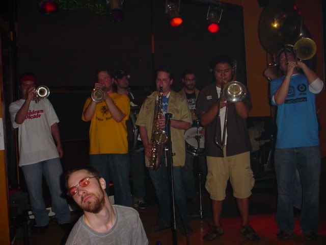 Not a very good picture, but I'm in back playing snare drum. My girlfriend took a fantastic picture at one of our gigs the next day where we're leading a second-line of six year-olds outside, I hope to have that one soon.