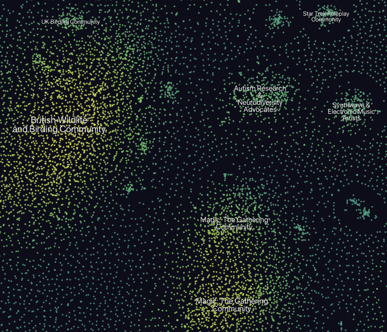 I made it by fitting a recommendation-engine style model with dot products to predict the probability that a person X follows person Y with 128-dim dimensions for "following" and "followers" and then squishing the followers embeddings into 2D with various iterations of tSNE.
