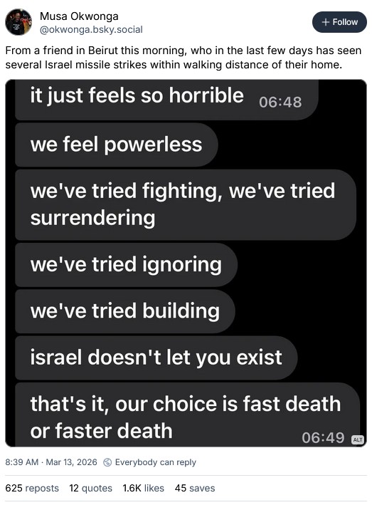 Just wanting to point out that Palestinians and others who have been subject to unjust and international war on their homelands are also feeling pretty traumatized at the moment.