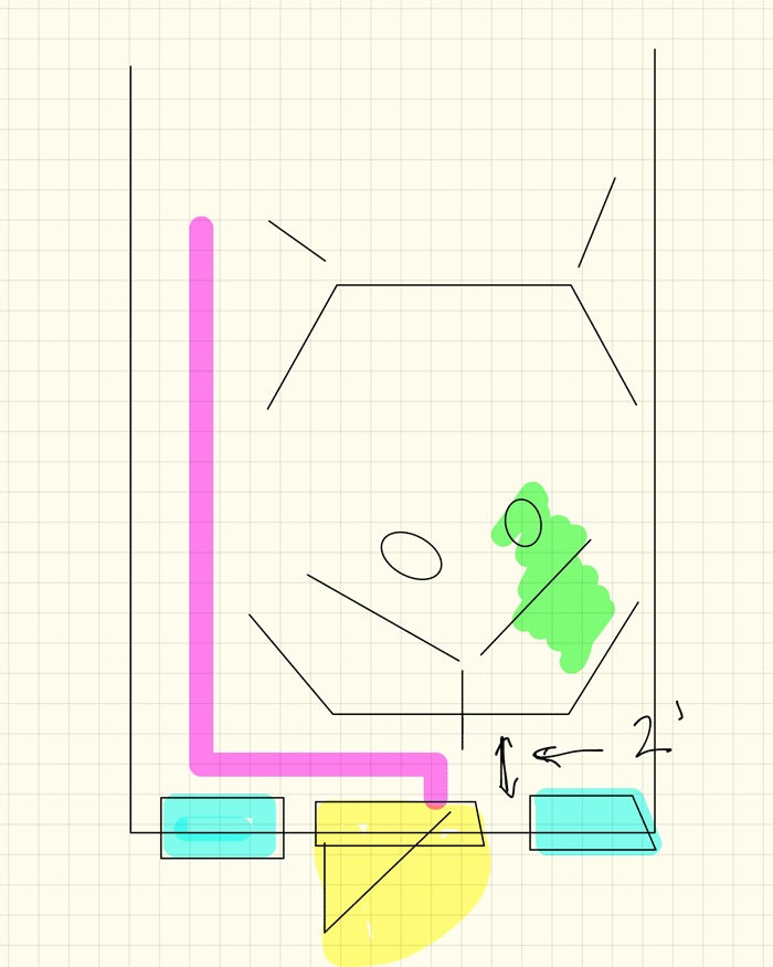 The windows are blue. The door is yellow. The magenta stripe illustrates the path to the door from the rest of the office. My desk is marked by green.