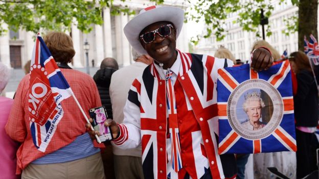 The usual lunatics are out to celebrate the monarch's birthday have their photo taken: