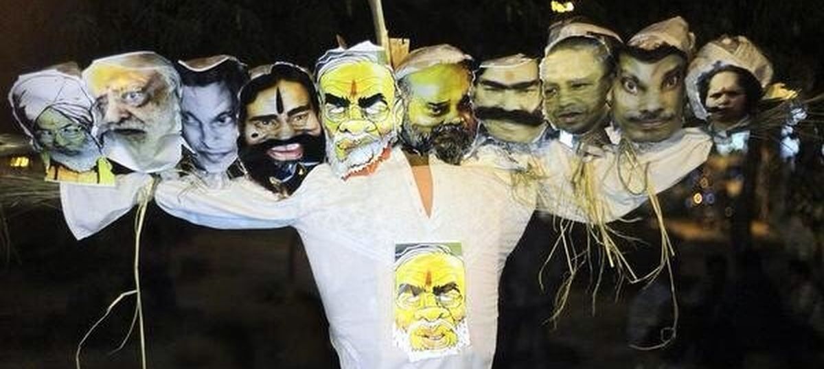 An effigy with ten heads depicting Prime Minister Narendra Modi, Bharatiya Janata Party president Amit Shah, yoga guru Ramdev and the Jawaharlal Nehru University vice chancellor, among others, was set ablaze on the campus on Dussera. The effigy was burnt on Tuesday by members of the National Students’ Union of India (NSUI), the student wing of the Congress.An NSUI spokesperson said the effigy was meant to symbolise the anti-poor and anti-people policies adopted by the National Democratic Alliance government, and burning it was the students’ symbolic gesture of burning the “evil” of the Centre’s policies.