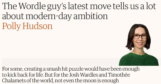 Itโs an easy & fun puzzle to do over a cup of teaThe once-a-day release and the social aspect (plus the visual aspect of the squares &c) is the inspired part for sure, itโs been said enough times but during the pandemic these low-stakes communal experiences are particularly appreciated. Same goes for that spelling bee thing that I donโt play because not free (also I played a trial version and it said LING is not a word which anyone whoโs ever done a crossword might have something to say about)