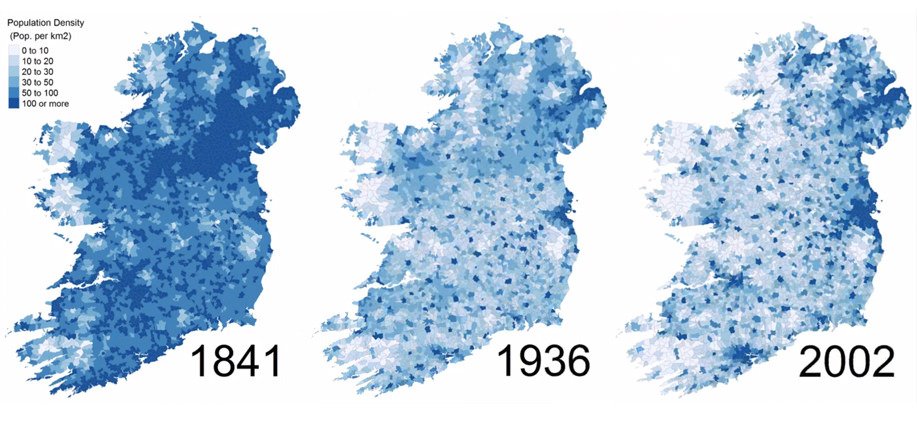 this a pretty stark graphic of the effects of war, famine, pestilence, death and mass flight if ever you are going to see one. Big nations recovered from Barbarossa, The Great Leap Forward, 30 year war, Terry Wogan etc. But the ROI is still half the size of it's 1841 population.