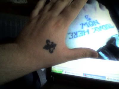 I thought I had a photo of the arm tattoo, but it's Dr Blasphemy's symbol (@#*!) from Rick Veitch's Brat Pack.