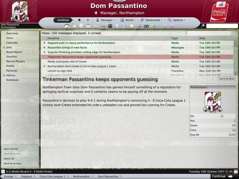 I'm busy dismantling the Cobblers with my own ineptitude, but then again I've never had any success managing the team I actually, y'know support, since CM97/98. Maybe I'll just manage Northwich Victoria.
