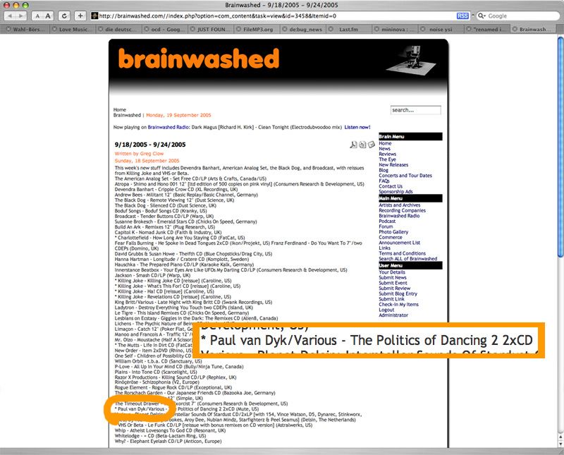Next week will be the last issue of The Brain. The Brain began eight years ago in August as a little place where Brainwashed staff members could keep tabs on each other: update the news section if there was any news about the bands whose websites they manage; write a few words about music or movies or books they've just experienced; and share emails with each other that are either amusing or ask questions which weren't already answered. Over time it built up, adding numerous features and sections. We were one of (if not) the first publications to post a new release schedule each week, we were one of (if not) the first to include sound samples with reviews, we were one of (if not) the first to outright ban major labels, and we were one of (if not) the first to feature a weekly video component. Out of all the trendiest big electronic publications, we arguably have had some of the most innovative music first, beating the trendiest trendsetters to the punch on bands like Dresden Dolls, Antony and the Johnsons, Sigur Ros, Gosdpeed You Black Emperor!, and Múm, just to name a few. Monday mornings will never be the same. Comments and feedback are welcome, and we'll be happy to post them in the final issue next week. Please include your name and city/country if you'd like them to be published. Thanks for your attention.