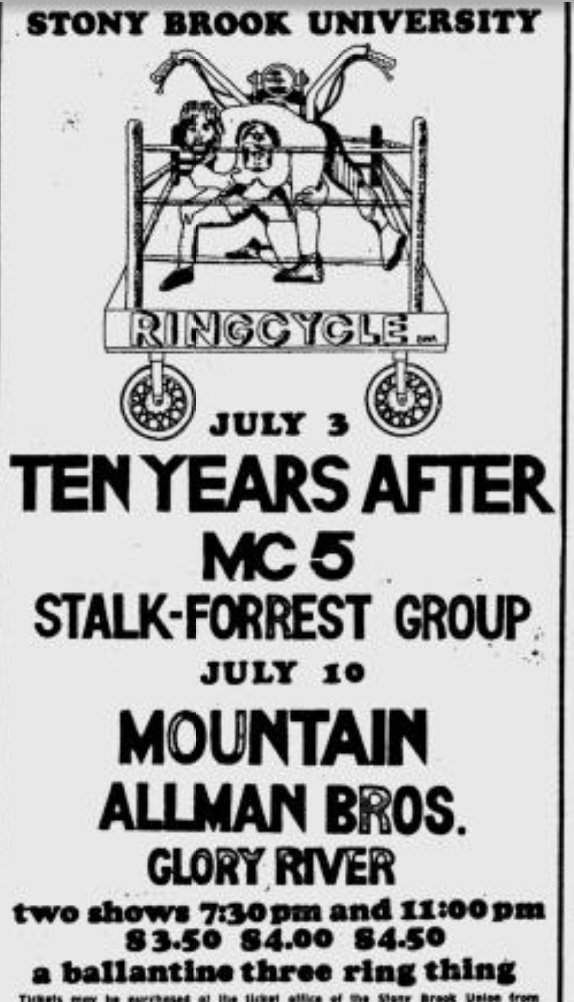 Aw heck---this won't let me copy image address, but click on the link and see it I guess. If you can't, it's a Stony Brook concert poster: July 10 will bring Mountain, who seem to be the headliners---Allman Brothers in slightly smaller letters---Glory Road smallest. Two shows 7:30 and 11:00 pm. Tickets $3.50 $4.00 $4.50. A ballentine three ring thing. Doesn't give year, but July 3 was Ten Years After, MC5, and Stalk-Forrest Group (locals, pre-BOC).https://pbs.twimg.com/media/Df-LME3VQAYIwIA.jpg:large