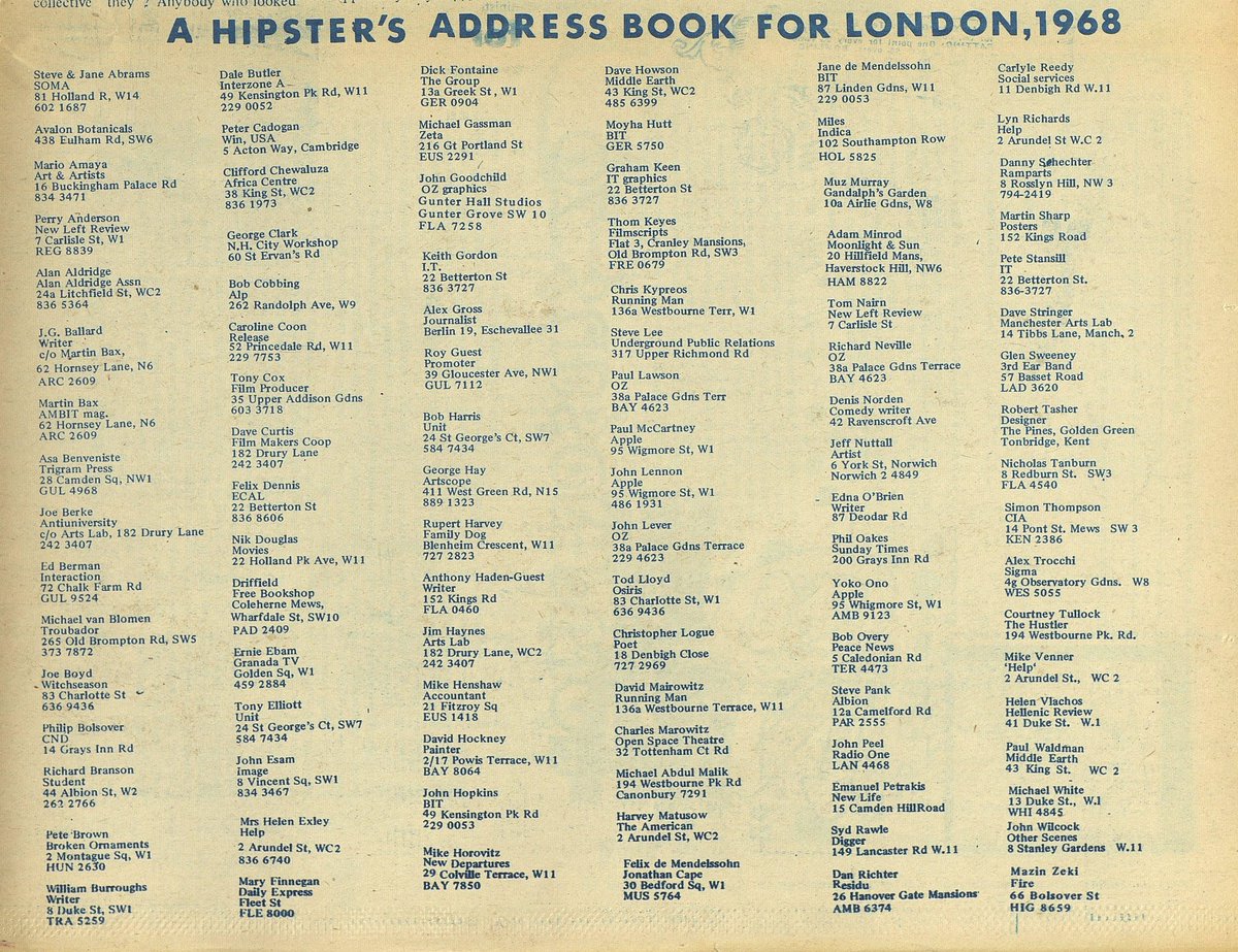 from LA Underground Mag OTHER SCENES: radical scenesters listed include some BEATLES, zappa-chronicler and rush-besmircher MILES, fake revolutionary, gangster-grifter and future murderer MICHAEL X (as michael abdul malik), NOT-YET-WHISPERIN BOB HARRIS (in his role as dep ed of early-days time out, the old grey whistle test was years away) and er DENIS NORDEN