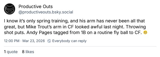 I’ve seen trout play twice now (iirc) and he’s hit his third home run in front of me― brony james (k3vin k.), Saturday, April 19, 2025 8:01 PM (yesterday)