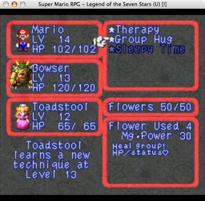 On the bottom screen there are four different hearts. By touching the top left heart that’s smiling joyously you’ll put Peach in bliss state. This gives Peach the ability to fly if you hold A. Touch the top right heart and Peach will move into a rage. In this state she’ll have an aura of fire around her, which is perfect for burning bridges or goombas foolish enough to run into her. The bottom left heart draws upon Peach’s sadness. In this state she endlessly cries, but her tears can be used to grow beanstalks.